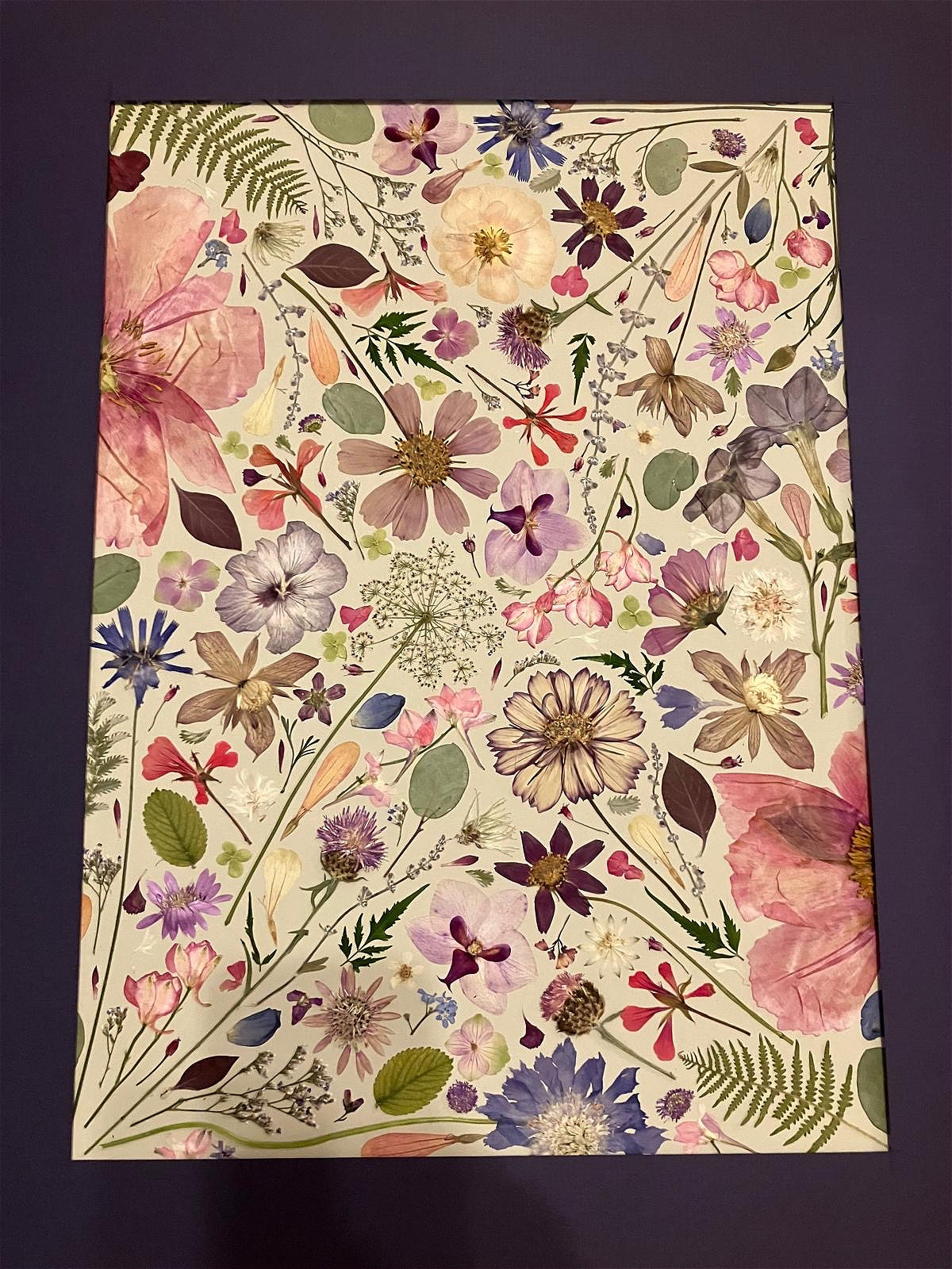 This original artwork features summer garden blooms including cosmos, peony, larkspur, scabiosa and geraniums on a pale green acid free mount board.
